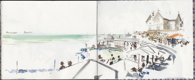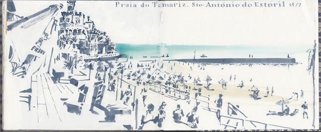 Aqui acabam os Estoris, dizia-se de forma trocista no início do séc.XX, Cascais – nobreza, Monte Estoril - grandeza, Estoril – grandela, São João – meia tigela! Ilustração de uma estratificação social que assim classificava a sucessiva ocupação e edificação dos terrenos para nascente. São João do Estoril foi ao longo do tempo sucessivamente retalhada, primeiro pelo Caminho de ferro que delimitou a fronteira entre alguma populacão rural residente a norte e as construções apalaçadas de veraneio a sul. Mais tarde com a construção da marginal que aqui bifurcou e separou o lado sul em retalhos, caminhos e becos sem saída. No caminho sinuoso para a praia passa-se pelo Santini com a menor fila à porta que se conhece, parece estar ali um pouco deslocado! Alguns metros à frente depois de virar a esquina sou tentado a entrar numa drogaria de bairro que pensava já não poder existir. Tudo ainda se vende naquele lugar fiel ao cheiro próprio das drogarias antigas, que nunca soube identificar ou saber a proveniência, provavelmente fruto da soma de todas as proveniências que estão expostas nas prateleiras, penduradas no tecto ou nas paredes. A porta abre directa para o tráfego de um dos sentidos da marginal, a drogaria Rodrigues é um exemplo ainda vivo do tempo em que estas ruas eram feitas a pé ou pelo menos a uma velocidade de passeio. A esta hora da manhã enquanto não se levanta a nortada e a briza vem do mar, quando se atravessa a segunda via da marginal já cheira às algas. Uns metros à frente antes de descer pelos sucessivos degraus de acesso à praia tem-se uma vista elevada sobre a transparência da água e do pequeno areal da Azarujinha. Talvez seja esta a mais mediterrânica praia urbana de Portugal, talvez a mais bonita praia da linha, talvez Proust tenha razão, viajar não tem a ver com a distância, a melhor maneira de ver com novos olhos talvez seja mesmo fazer um desenho.