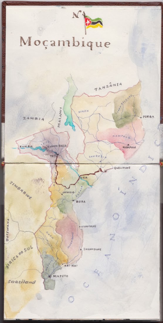 Depois da enorme volta por Angola, que na escala do mapa afinal se completa com meia dúzia de polegadas, à chegada a Maputo durante a longa espera do vôo para Quelimane desenhei o mapa de Moçambique. Nada como desenhar para decorar o recorte geográfico, ter a noção real do caminho a percorrer e inteirarmo-nos da verdadeira escala de um país. Logo cedo me apercebi que também ali tal era tão vasto o território, que a longa viagem que se adivinhava pelas margens do Zambeze entre o Zumbo e Quelimane no mapa pouca expressão tinha.