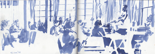 O desenho anterior fez juntar uma pequena multidão de crianças curiosas; desenhar tem o efeito magnético de atrair pessoas e de as juntar no fascínio e na surpresa de ver quem descobre primeiro as formas que de uma maneira quase mágica se vão revelando. Queriam ficar todas no boneco, acotovelavam-se para caberem na dupla página do pequeno formato do caderno, no fim fui eu quem pousou para uma delas.
