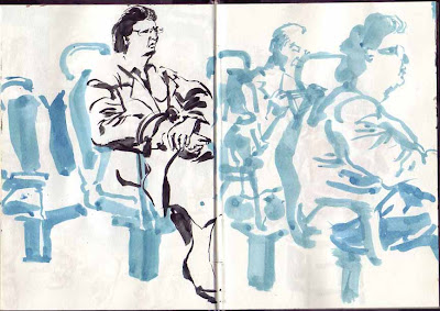 No tempo de um desenho as pessoas deixam o cruzamento, descem a rua em mira de novas paragens. Mas há sempre quem fique aqui e acolá terminando conversas, curando bebedeiras, ou prolongando namoros.